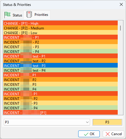 The list of all possible ticket priorities is retrieved. By selecting one of these priorities, you can choose the short text assigned to it from the drop-down list. By double-clicking on the example at the bottom left, you can change the status color.