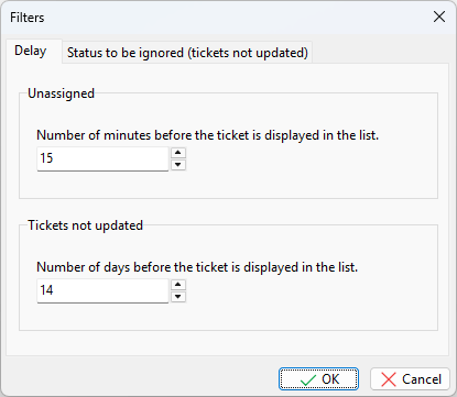 This window allows you to define delays before the tickets appears in unassigned tickets (by default 15 minutes) and the number of days before the tickets appears in the without update list (by default 14 days).