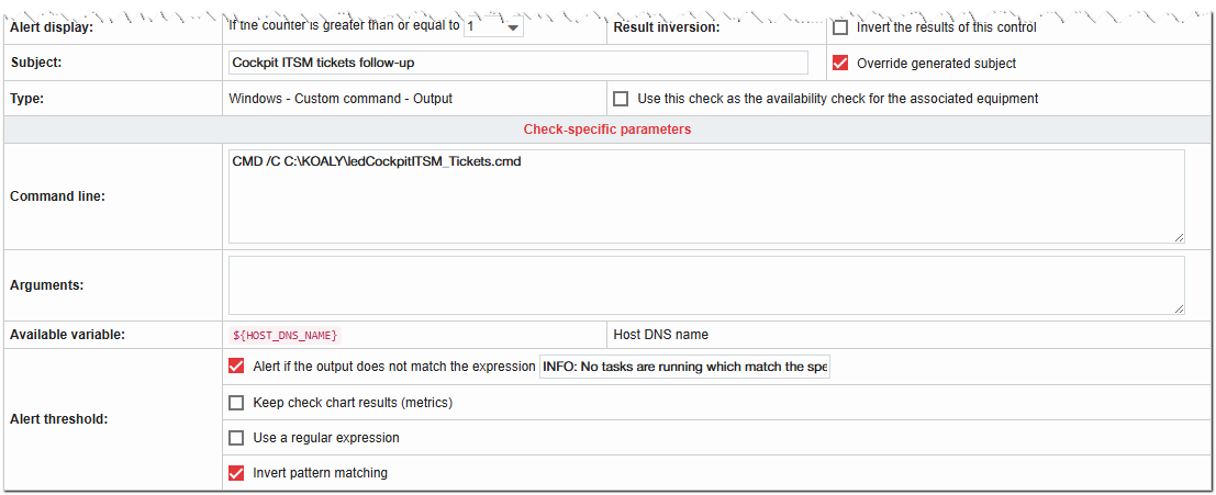 Since Cockpit ITSM waits a maximum of 30 seconds for a command to be returned, a batch file must be used to execute the program. Here's its content (to be adapted to your directories):