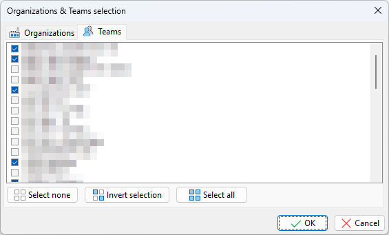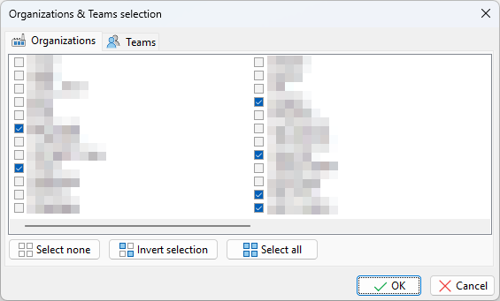 Depending on the organizations selected, all teams linked to these organizations are displayed in the second tab. From these teams, select those that need to be checked.