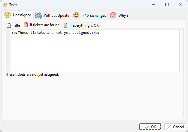 - Unassigned –> If tickets are found: %NBMINUTES% represents the number of minutes before the ticket is displayed in the list.