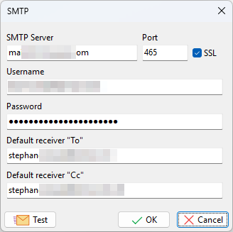 Configuring access to the SMTP server. Test email addresses can be entered (when you do not want to send the message to all recipients).