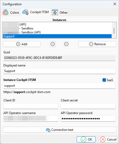 Sélection des instances Cockpit ITSM ainsi que des accès API. Il n'y a pas de limite dans le nombre d'instances. Chaque instance est associée à un identifiant unique (GUID) qui sert d'identifiant à la base de données locale.
