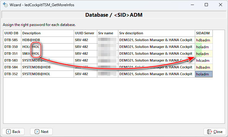 Pour chaque base de données, sélectionner l'utilisateur SIDADM. Il faut que ces utilisateurs soient saisis dans le coffre fort de Cockpit ITSM et qu'ils soient liés à la base de données. Voir cet article de la KB: Gestion des données sécurisées