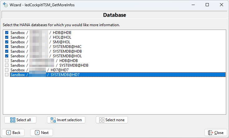 Parmi toutes les bases de données HANA, sélectionnez celles pour lesquelles vous désirez récupérer des informations supplémentaires.