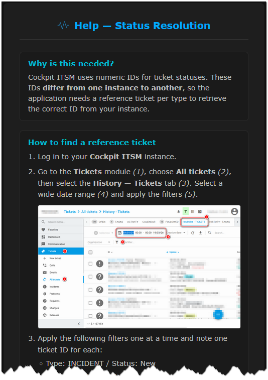 L'API GET {instance}/api/repository/objects ne peut pas remonter les identifiants des status fixes (comme New, Acknowlegded, …) Pour ces status, il faut saisir un ticket exemple dans la partie basse de l'écran afin de trouver le status. Une page d'aide explique comment faire.