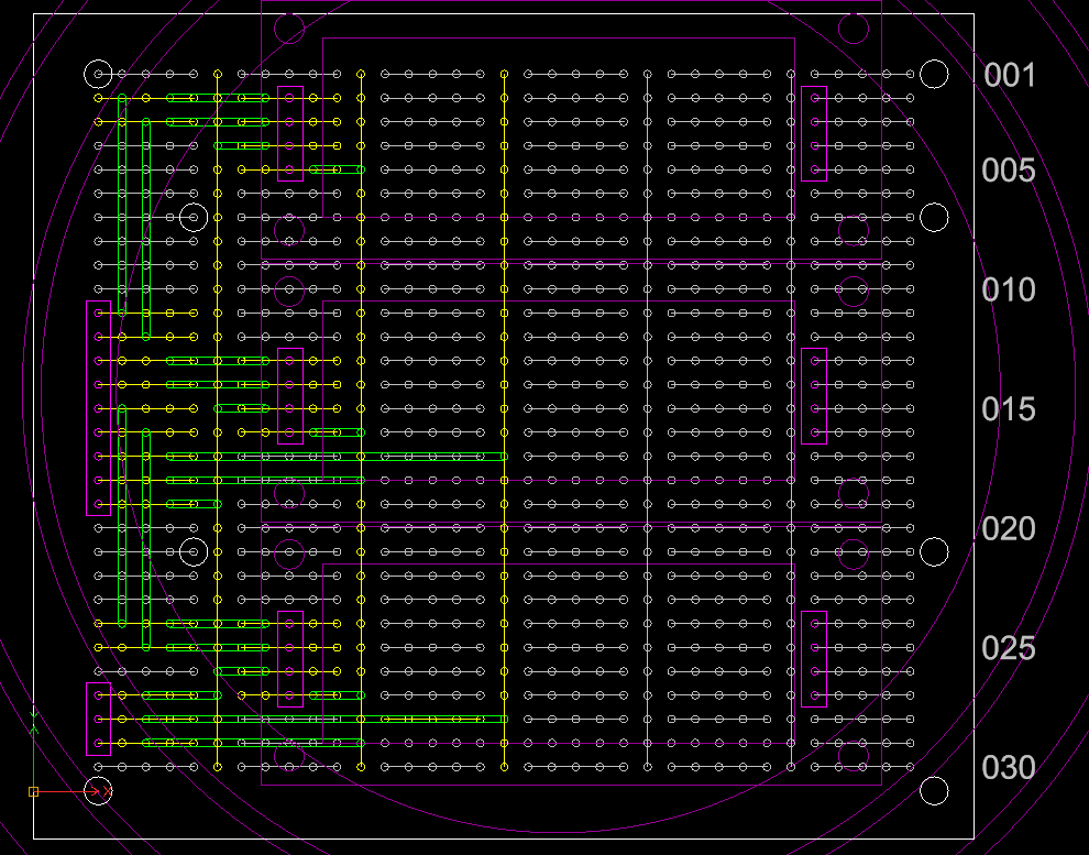 Les 4 trous extérieurs servent à fixer le veroboard au support final. Utiliser des entretoises de 10mm entre le support et le veroboard.